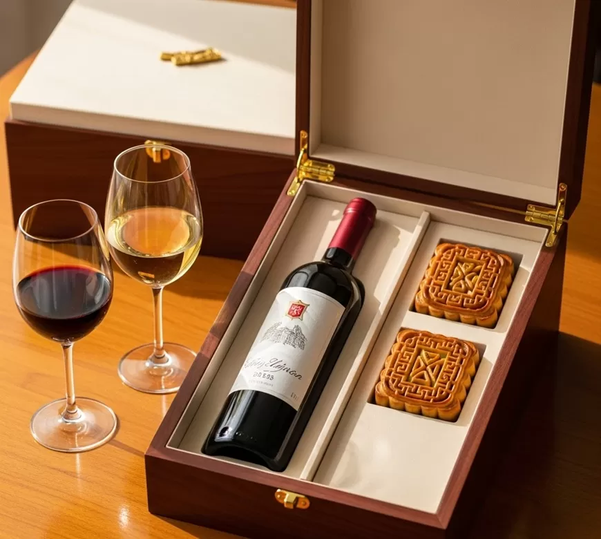 Một chai rượu vang sẽ trở nên sang trọng hơn nếu đi kèm hộp gỗ, hộp da hoặc túi quà cao cấp, đặc biệt khi kết hợp cùng bánh Trung thu thành set quà tặng hoàn chỉnh.