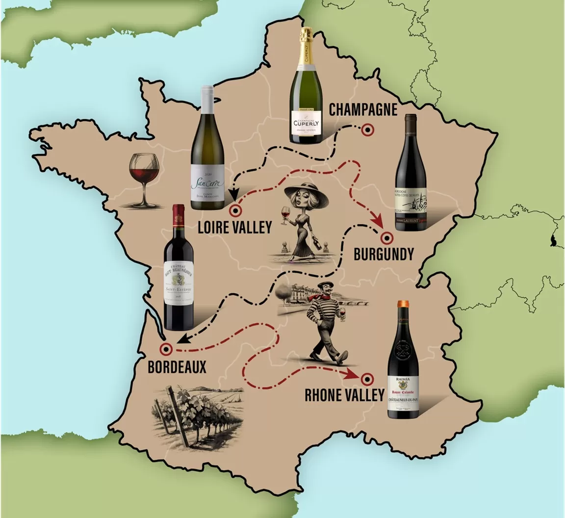 Vùng nổi bật: Bordeaux, Burgundy (Bourgogne), Champagne, Rhône, Alsace.